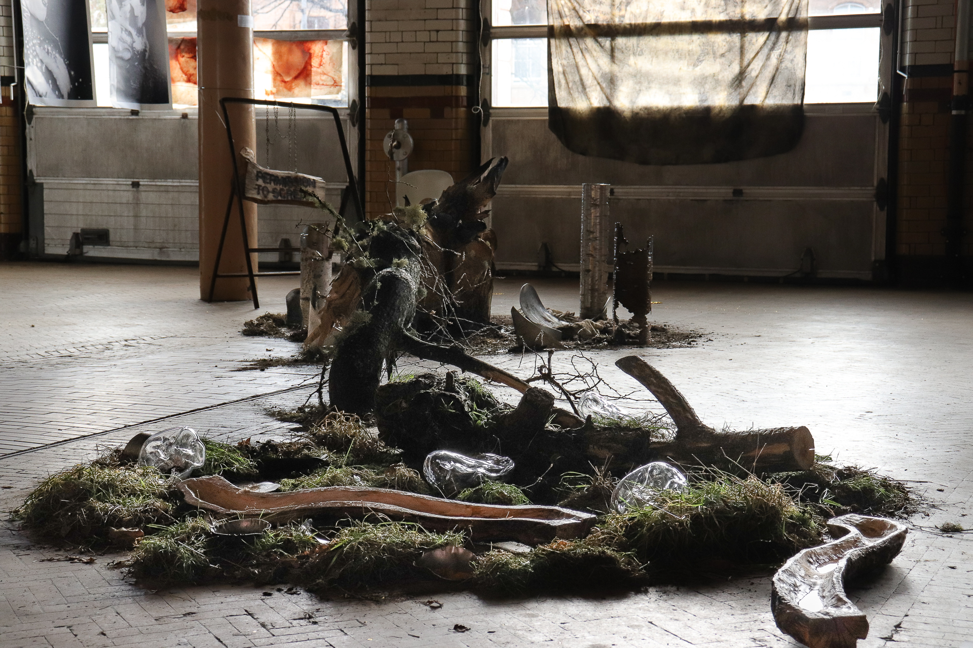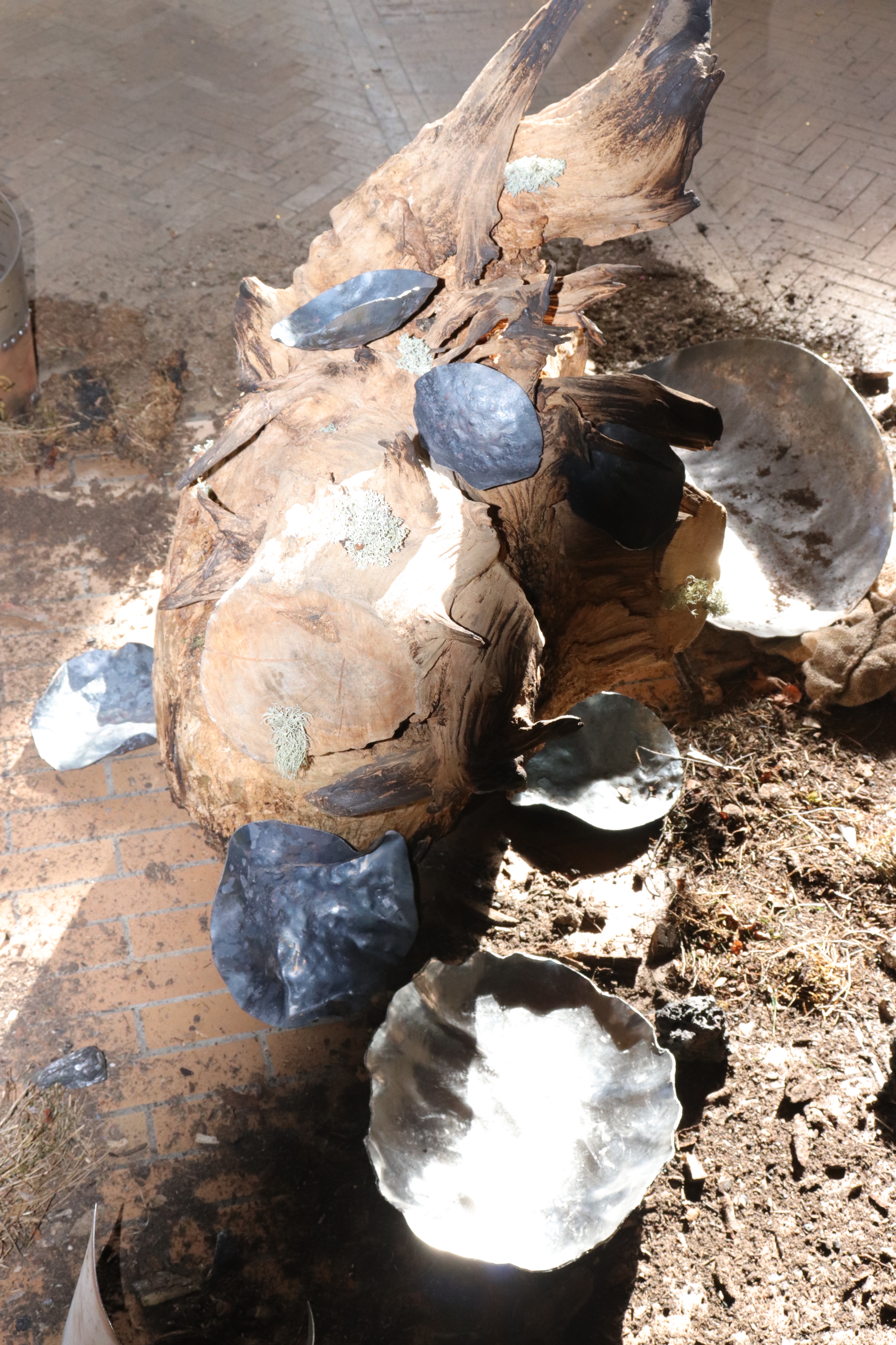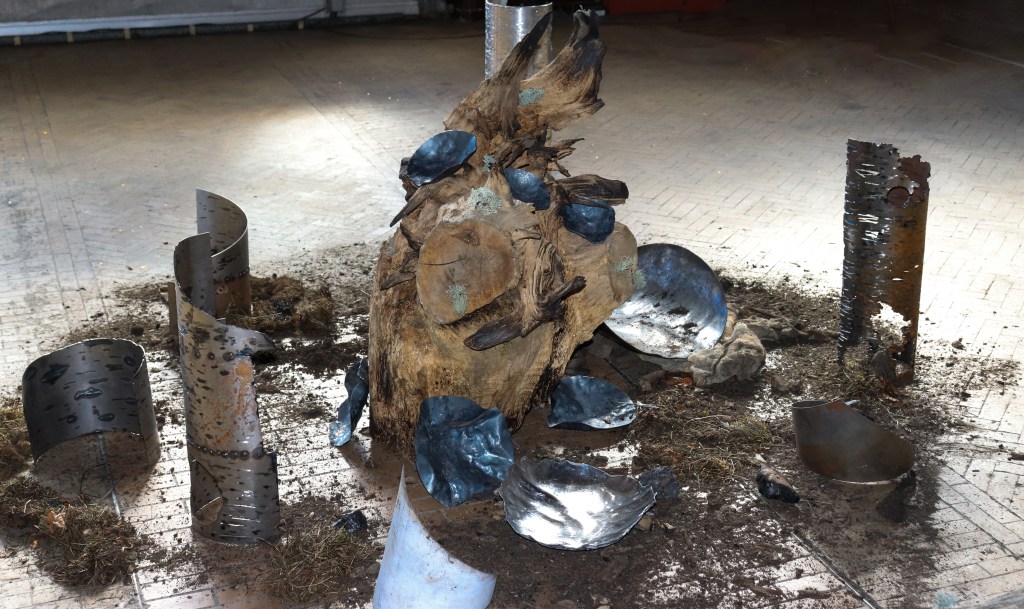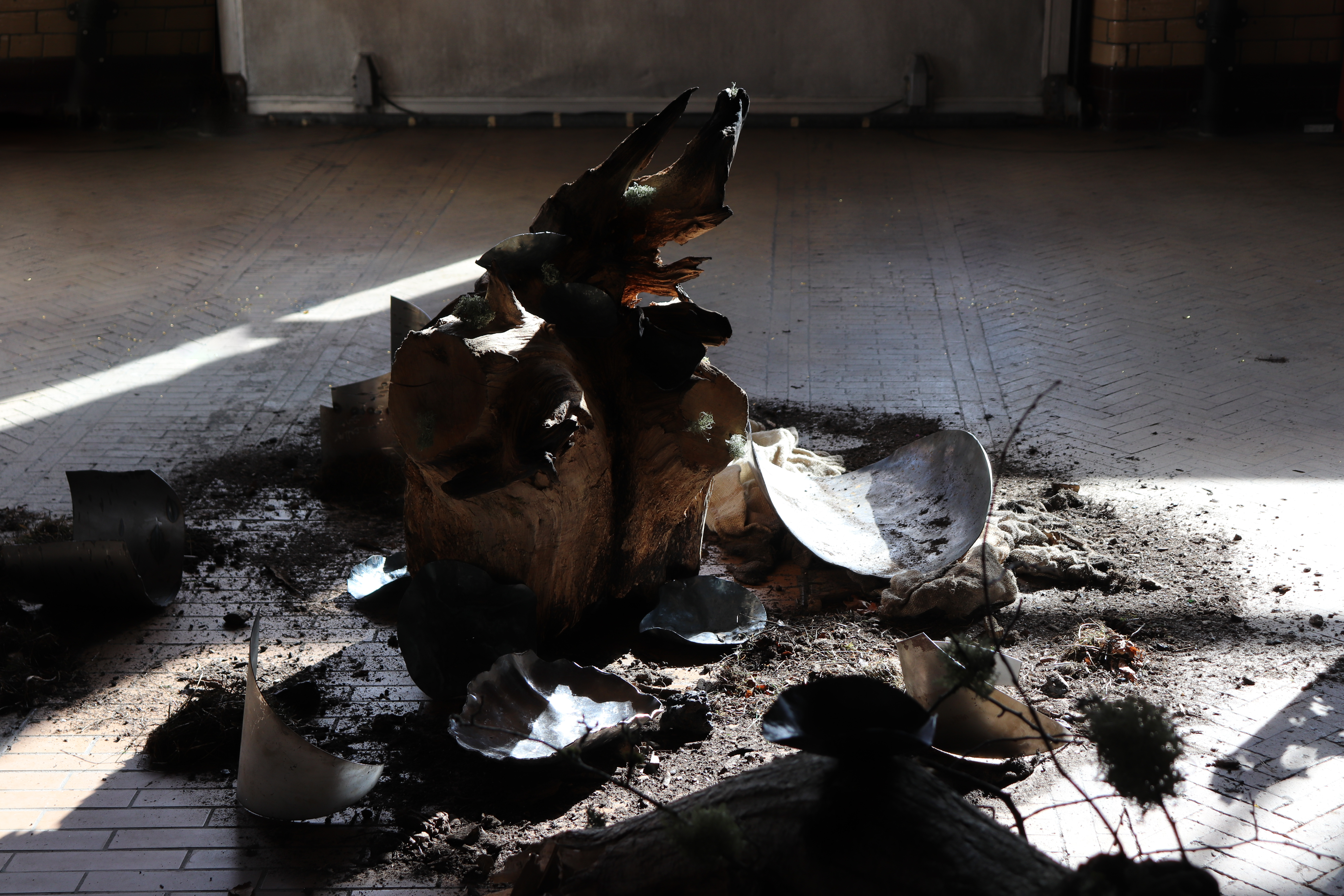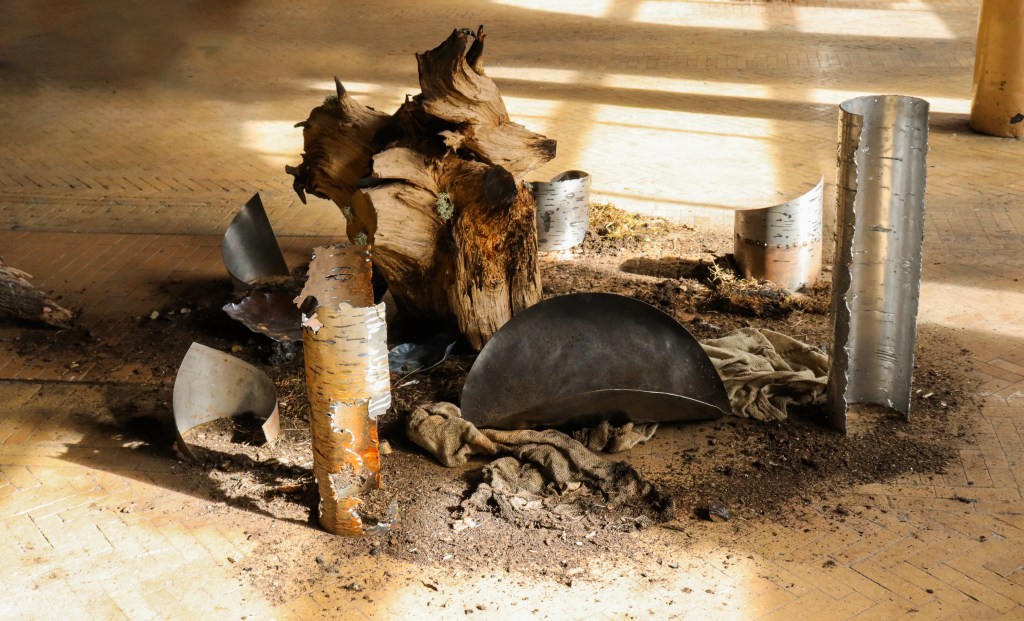 Dried root system, steel, aluminium, common local lichens and grasses, ashes, blown glass and soil